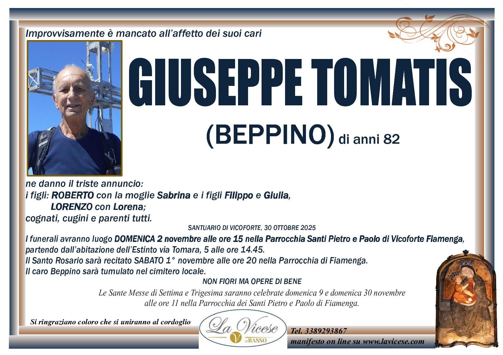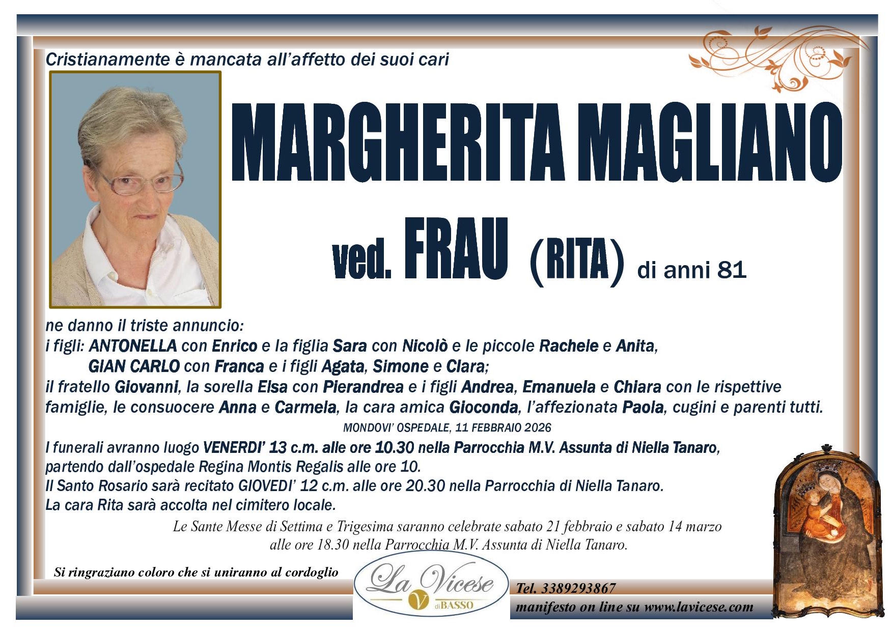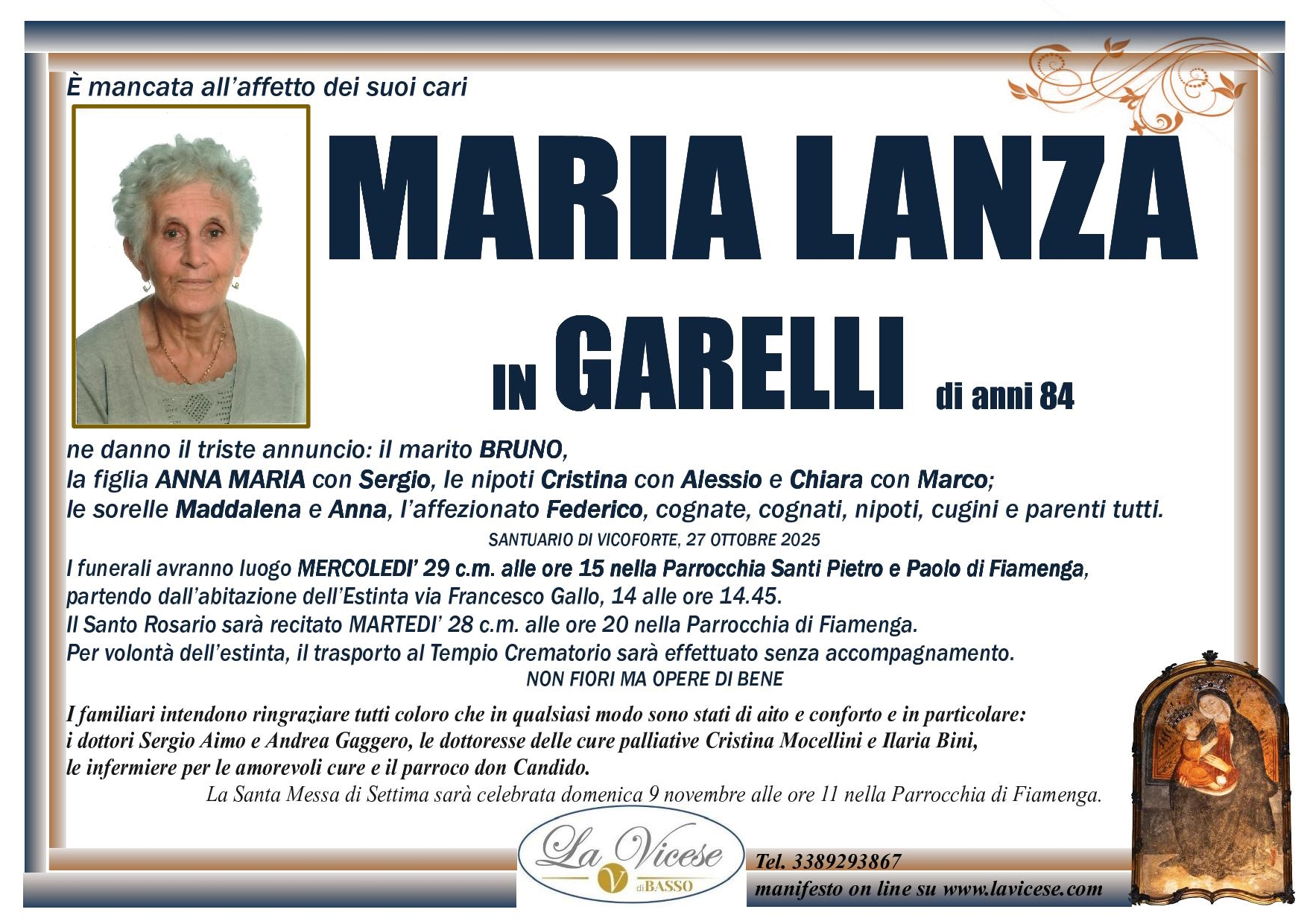 Grazie alla grande esperienza acquisita in oltre 30 anni di Attività, l’Agenzia funebre La Vicese di Vicoforte, in Provincia di Cuneo, assicura la massima e totale discrezione e la più elevata professionalità nell’esecuzione di ogni servizio, compreso quello di affissione. Questo perché un avviso di lutto raccoglie il dolore e la commozione dei familiari in un momento tanto triste e infelice.
