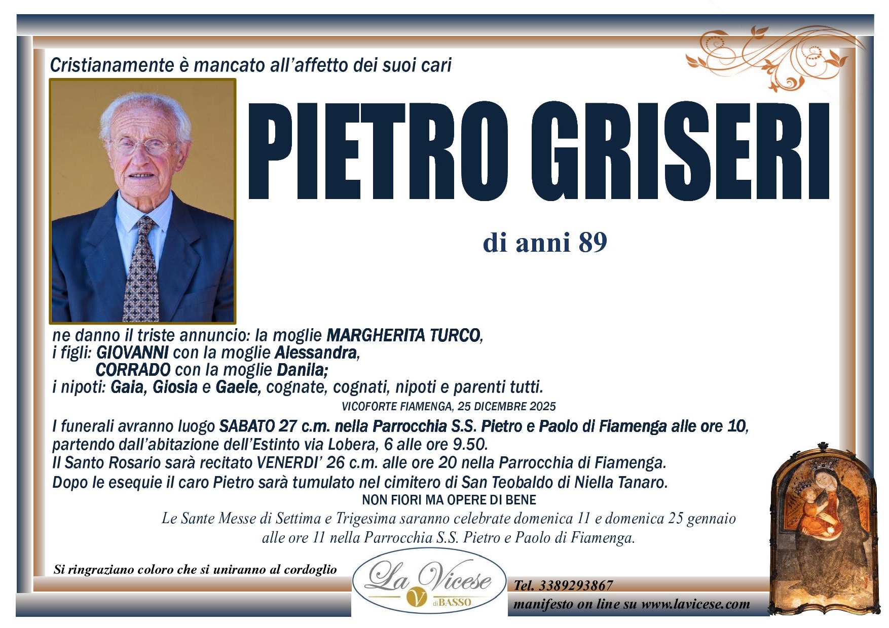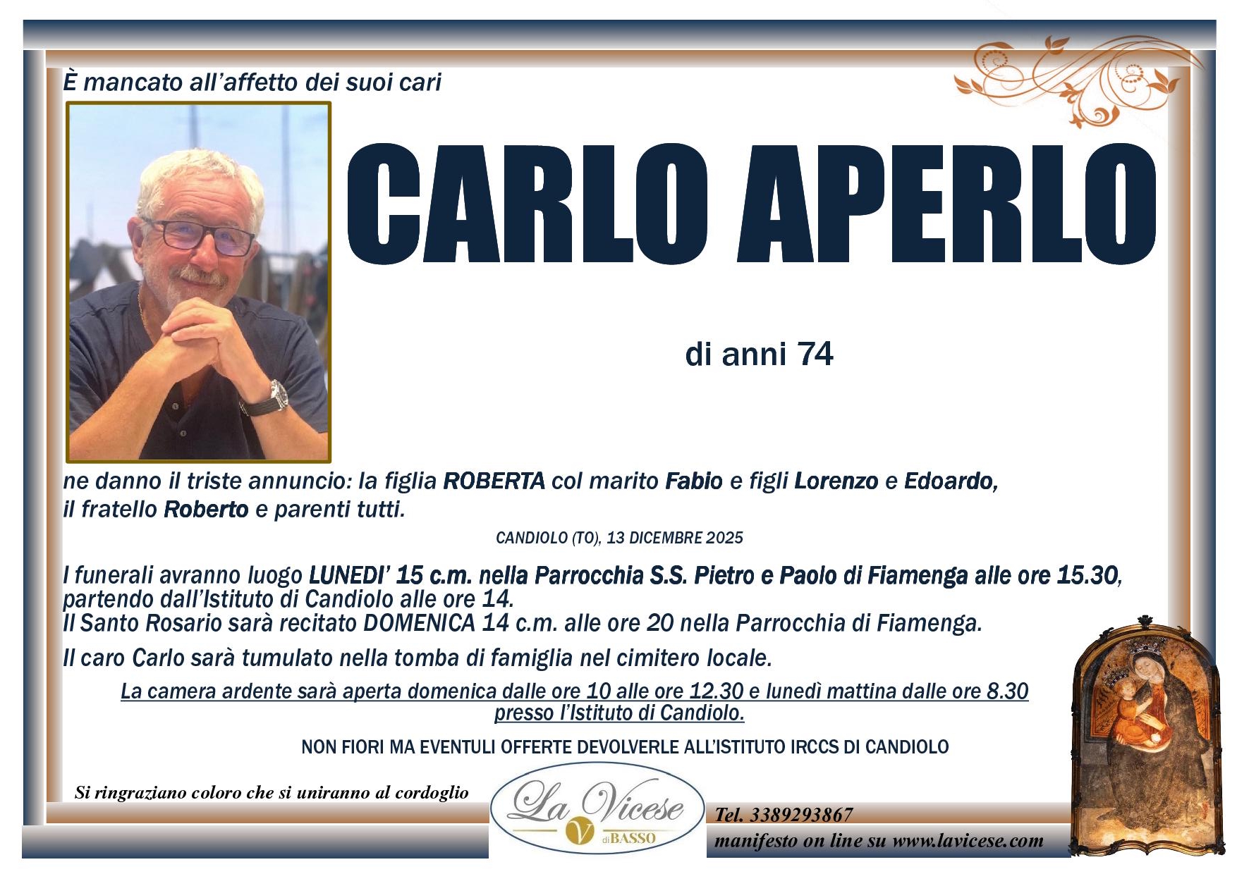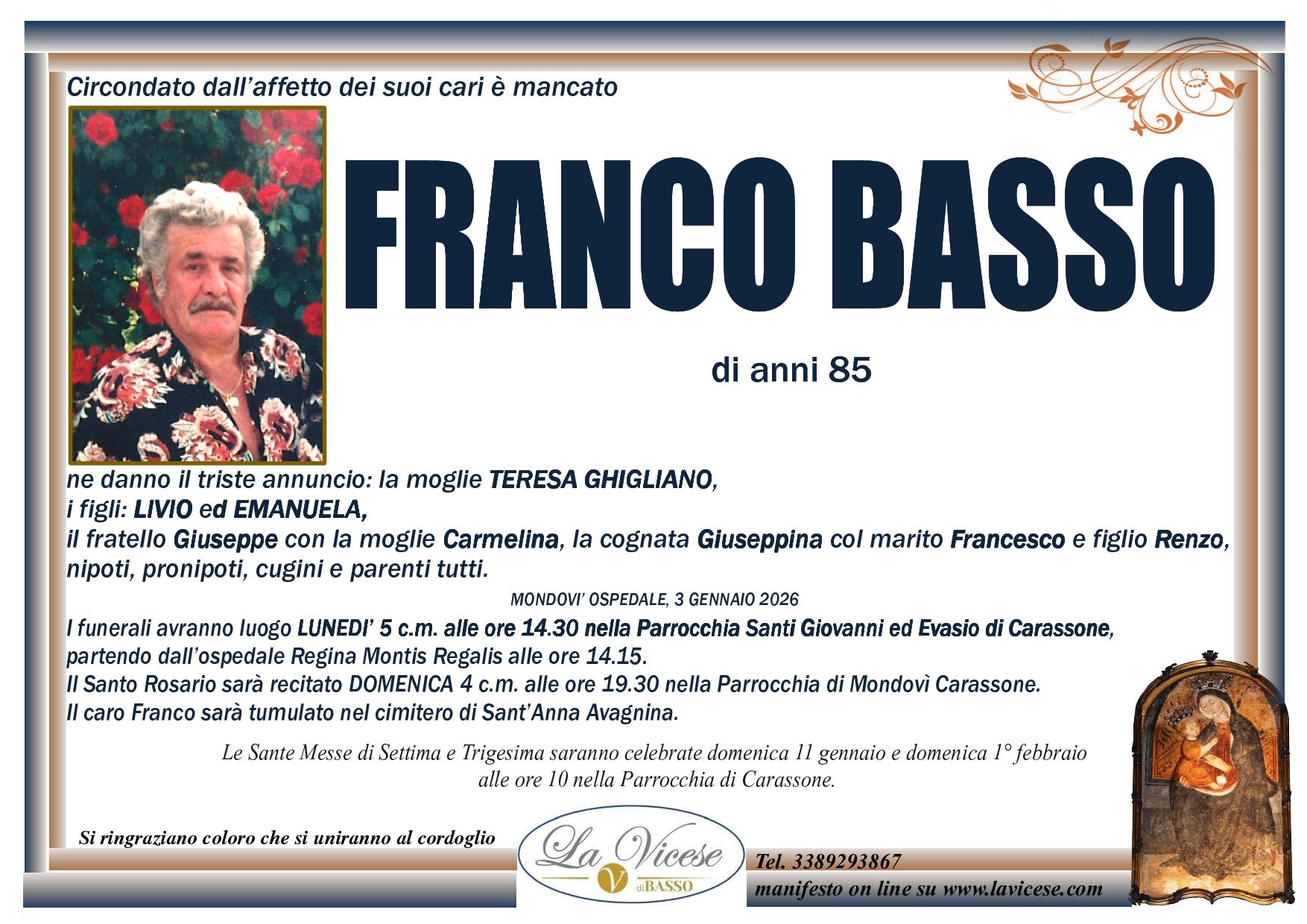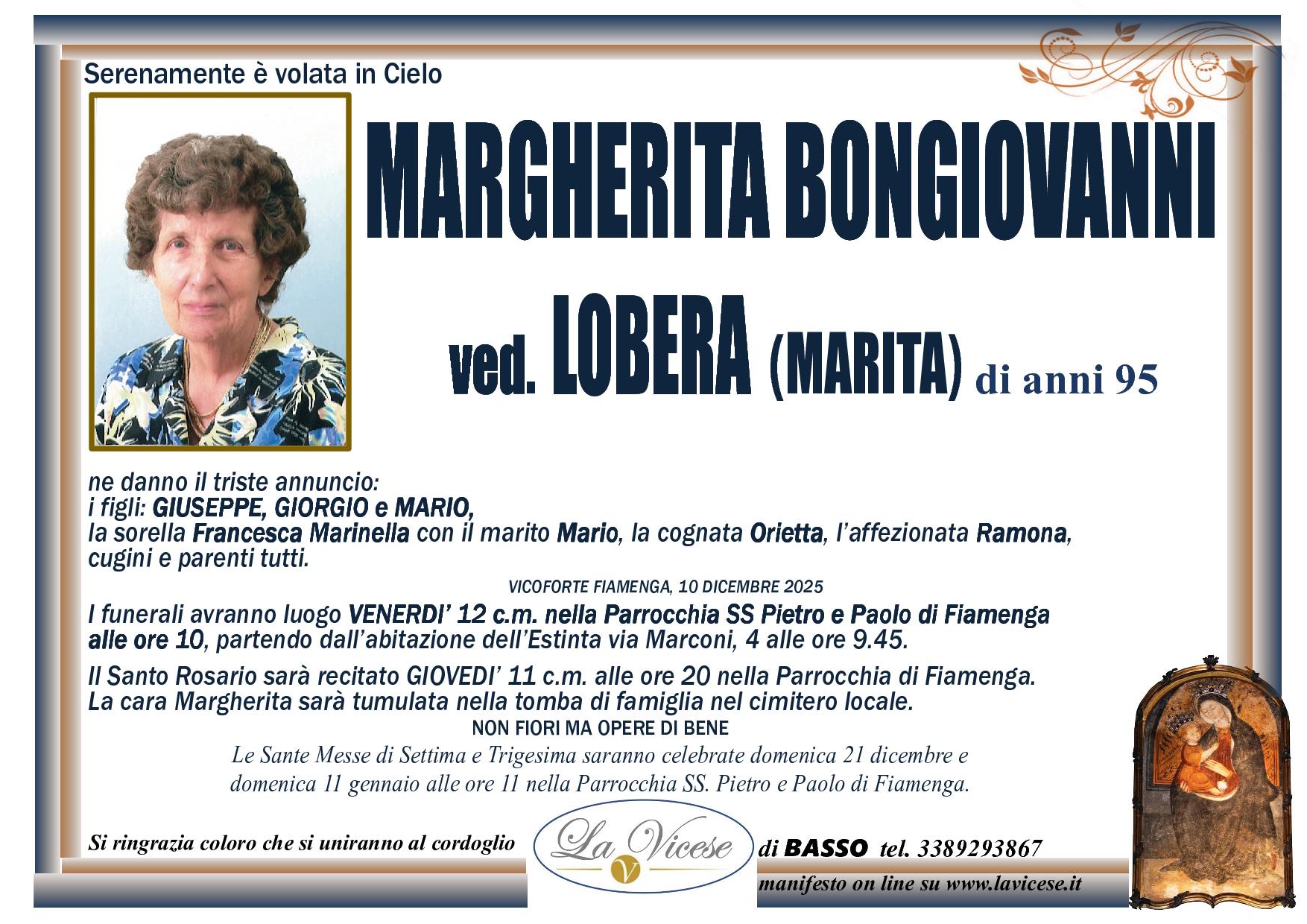 Grazie alla grande esperienza acquisita in oltre 30 anni di Attività, l’Agenzia funebre La Vicese di Vicoforte, in Provincia di Cuneo, assicura la massima e totale discrezione e la più elevata professionalità nell’esecuzione di ogni servizio, compreso quello di affissione. Questo perché un avviso di lutto raccoglie il dolore e la commozione dei familiari in un momento tanto triste e infelice.